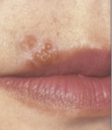 口唇ヘルペスは、単純ヘルペスウィルスが原因で、初期症状として患者さんは唇の違和感や刺激感を自覚し、その後同部位の発赤と腫脹が見られ、数日で小さな水泡が形成されます。